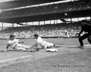 Pee Wee Reese slides into third base at Wrigley Field 1950