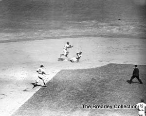 Pee Wee Reese (2) & Jackie Robinson turn a double play at Braves Field, Boston Circa 1952